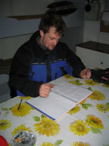 sledaferd27012003 023 Published 26.9.2014 at 360 × 480 in Hringferð um Fjörður ← Previous Jói skrifar í gestabókina. Skyldi hann hafa skrifað: “Kom hér á grænum Arctic Cat búðingi eftir erfiða ferð með Guðna frænda….”?
